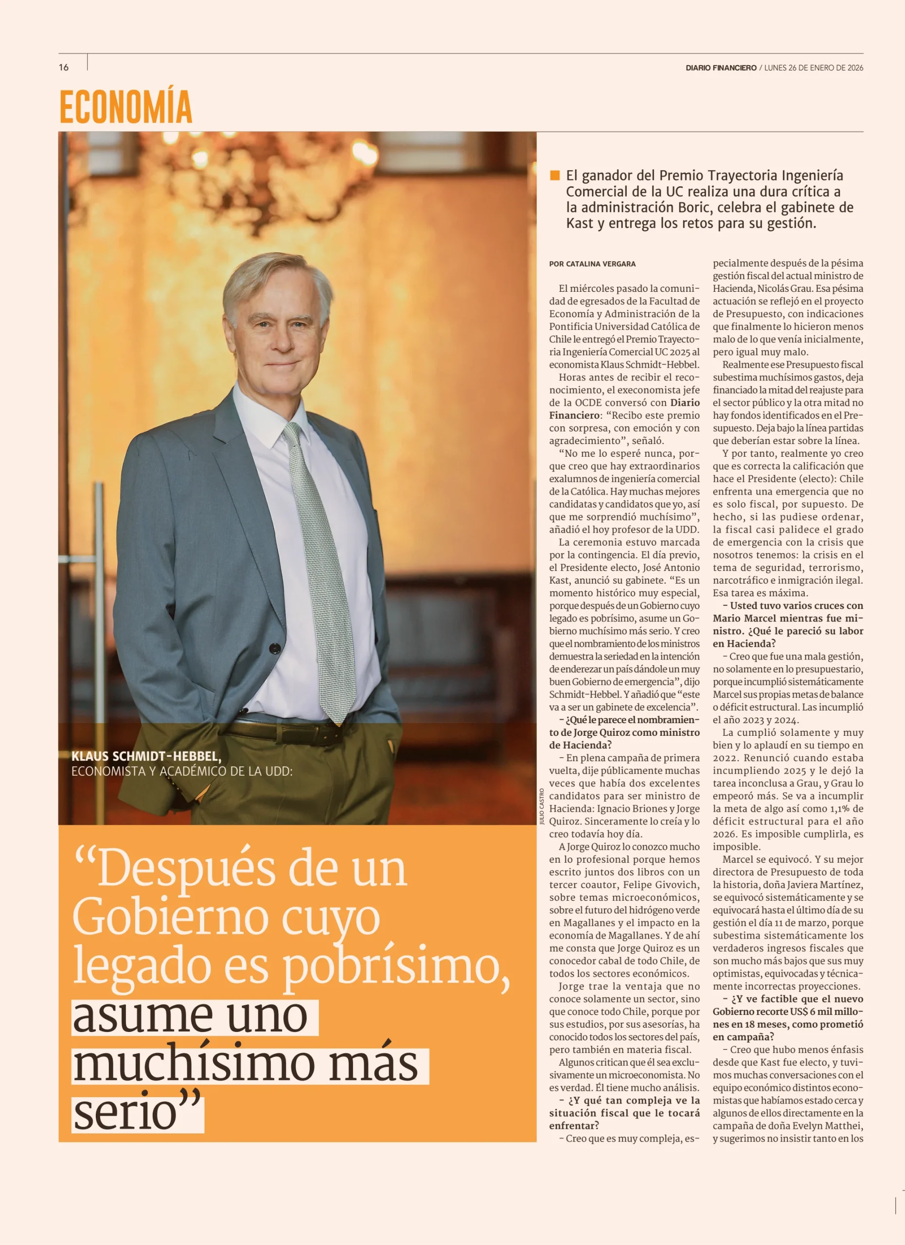 El economista Klaus Schmidt-Hebbel critica con dureza la gestión económica del gobierno saliente, calificando su legado como “pobrísimo”, especialmente en materia fiscal. Valora que el Presidente electo José Antonio Kast forme un gabinete que considera más serio y con foco en corregir los desequilibrios heredados. Advierte que el principal desafío será ordenar las finanzas públicas, enfrentar la emergencia fiscal y mejorar la credibilidad económica del país.