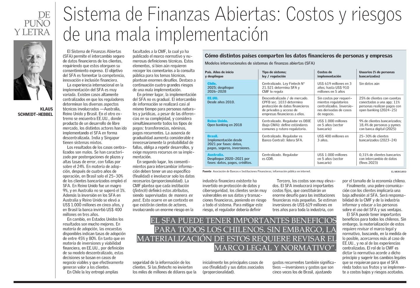 Klaus Schmidt-Hebbel analiza los desafíos del Sistema de Finanzas Abiertas (SFA) que Chile está implementando, destacando los riesgos de un marco regulatorio deficiente y de una implementación apresurada. Advierte que, aunque el sistema puede ofrecer grandes beneficios en transparencia, competencia y servicios financieros, una mala ejecución podría poner en peligro la seguridad de los datos personales y la estabilidad del sistema financiero. Propone revisar el marco legal y normativo antes de su entrada en vigor total.